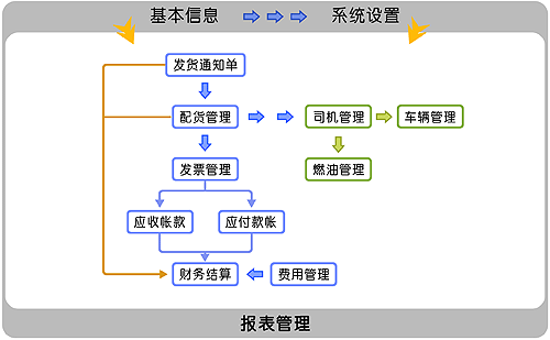 系统按照物流运输基本业务流程进行系统设计,从而将企业战略目标和企业的业务管理结合起来,并将系统计划、配货、车辆管理、燃油消耗、运输、验收、应收应付统一在同一框架之中,以实现业务的协同处理,提高企业快速反应能力。
